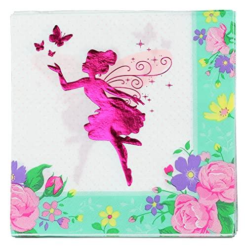 - These napkins have a silhouette of a fairy and butterflies in hot pink with a multicolored floral border