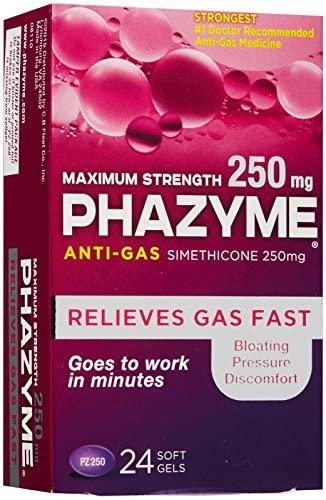 When you need serious gas relief, turn to Phazyme the strongest name in OTC gas relief. Phazyme Maximum Strength works in minutes to relieve the discomfort, bloating and pressure associated with gas by working to break up gas bubbles in the stomach and intestines. Each easy-to-swallow fast gel contains 250 mg of simethicone, the #1 doctor-recommended OTC anti-gas ingredient. Phazyme is also available in Ultimate Fast Gels, Ultra Strength Fast Gels, and Maximum Strength Gas and Acid Relief Chews. No matter what type of relief is needed, Phazyme has a product thats right for you. Phazyme is serious medicine for serious gas.